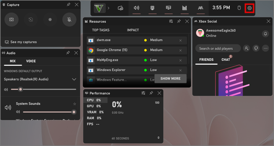 2. Klicken Sie oben rechts im Xbox Game Bar-Menü auf das Symbol Einstellungen, um die Einstellungen der Spielleiste zu öffnen.