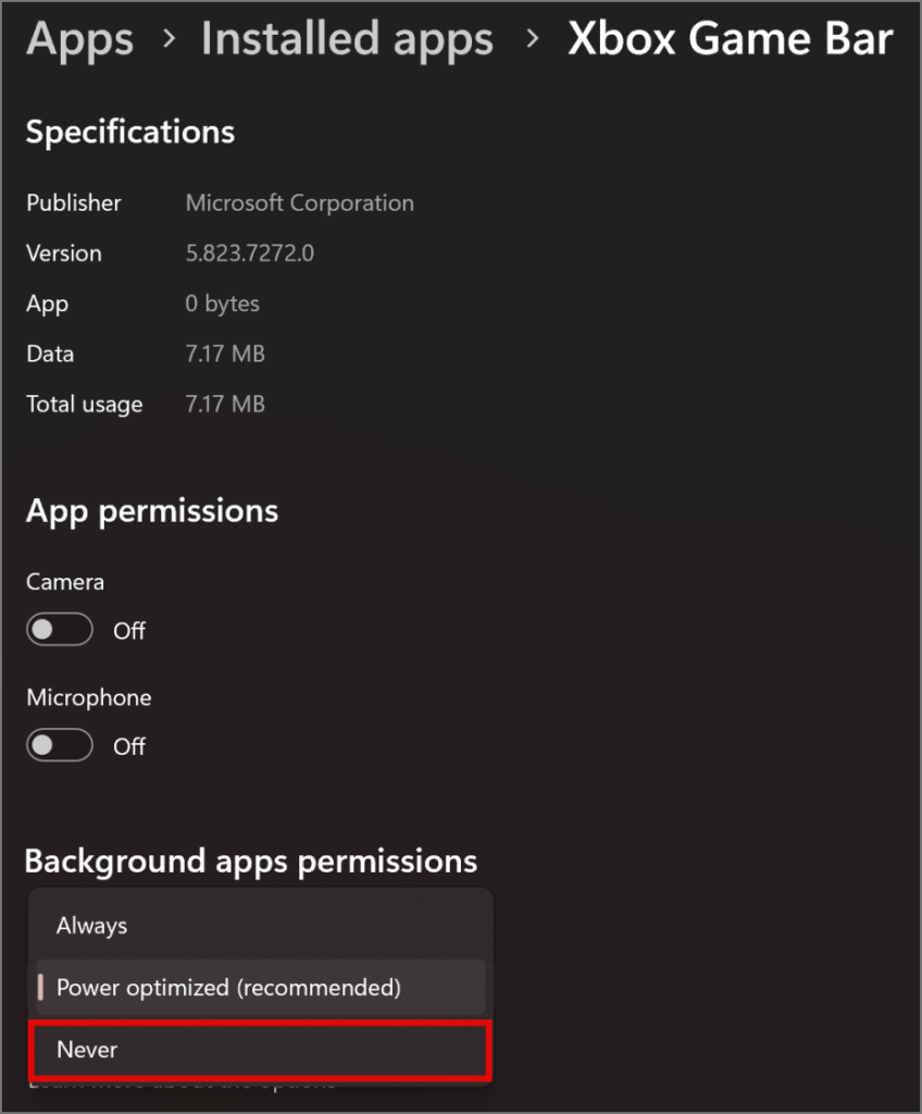 9. Um die Spielleiste bei Bedarf EIN zu schalten, legen Sie die Berechtigungen für Hintergrund-Apps auf Energieoptimiert fest, was auch die Standardeinstellung ist.