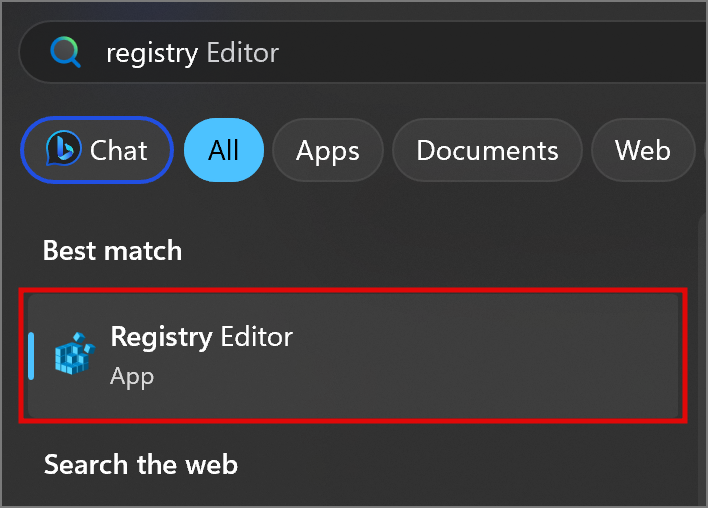 1. Um die Game Bar zu deaktivieren, suchen Sie über das Suchsymbol in der Taskleiste nach Registrierungseditor und klicken Sie auf die App Registrierungseditor.
