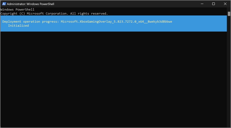 3. Sobald der obige Befehl ausgeführt wird, wird im PowerShell-Fenster außerdem eine Liste mit Befehlen angezeigt. Sobald die Befehle ausgeführt werden (keine Bewegung auf dem Bildschirm), sollte die Xbox Game Bar deinstalliert werden. Dies kann im Abschnitt Installierte Apps in den Windows-Einstellungen überprüft werden.