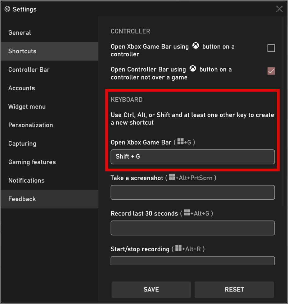 4. Suchen Sie nun im Abschnitt Tastatur nach Open Xbox Game Bar. Es wird ein Leerzeichen zur Eingabe einer neuen Tastenkombination vorhanden sein.