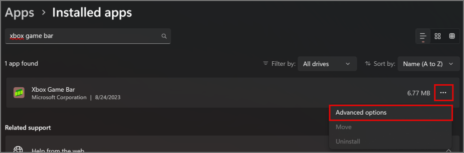 4. Klicken Sie auf das Symbol mit den drei Punkten rechts neben der Xbox Game Bar-App, um das Dropdown-Menü zu öffnen. Klicken Sie dann auf Erweiterte Optionen.
