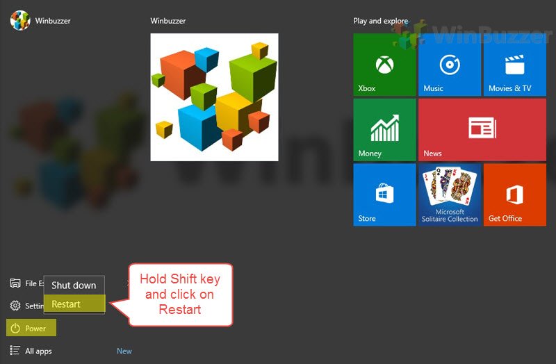 Gehen Sie zunächst zum Startmenü und klicken Sie auf Ein/Aus und dann Sie halten die Shift-Taste gedrückt und klicken auf Neustart.