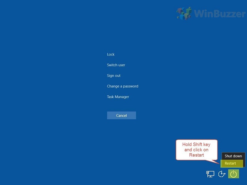 Wenn Sie das sehen Auf dem Willkommensbildschirm oder dem Sperrbildschirm befindet sich ganz rechts unten ein Einschaltknopf. Klicken Sie auf diese Einschalttaste und während Sie die Umschalttaste gedrückt halten, drücken Sie auf Neustart.