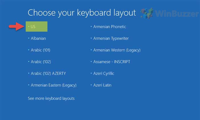 Schalten Sie Ihren Computer ein, laden Sie Ihr System von einem vorhandenen USB-Wiederherstellungslaufwerk und wählen Sie die Sprache Ihres Tastaturlayouts aus. Danach sehen Sie die Erweiterten Startoptionen.