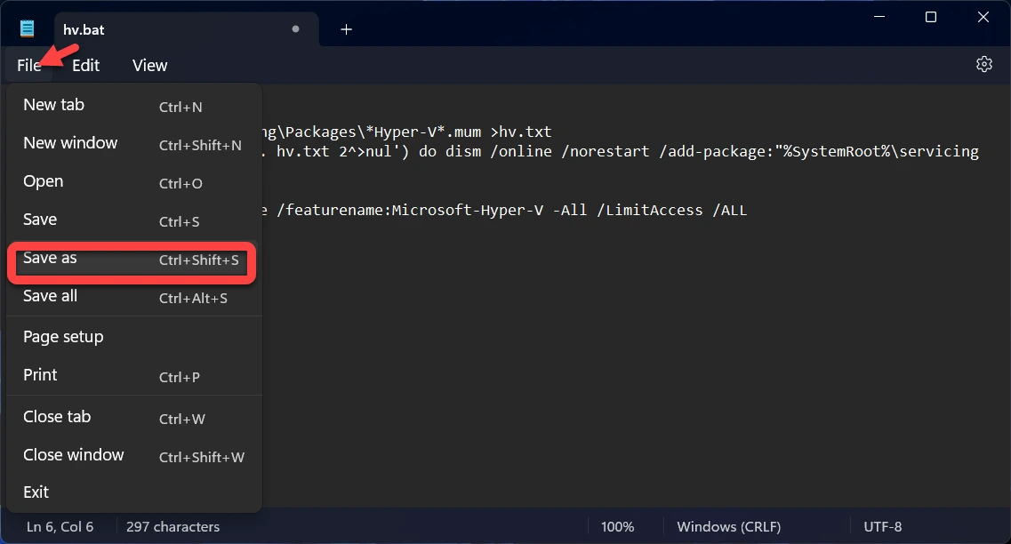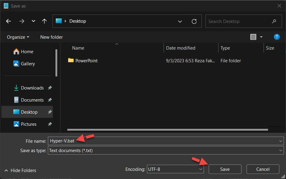 Schritt 4. Speichern Sie die Notepad-Datei als Hyper-V.bat auf dem Desktop.