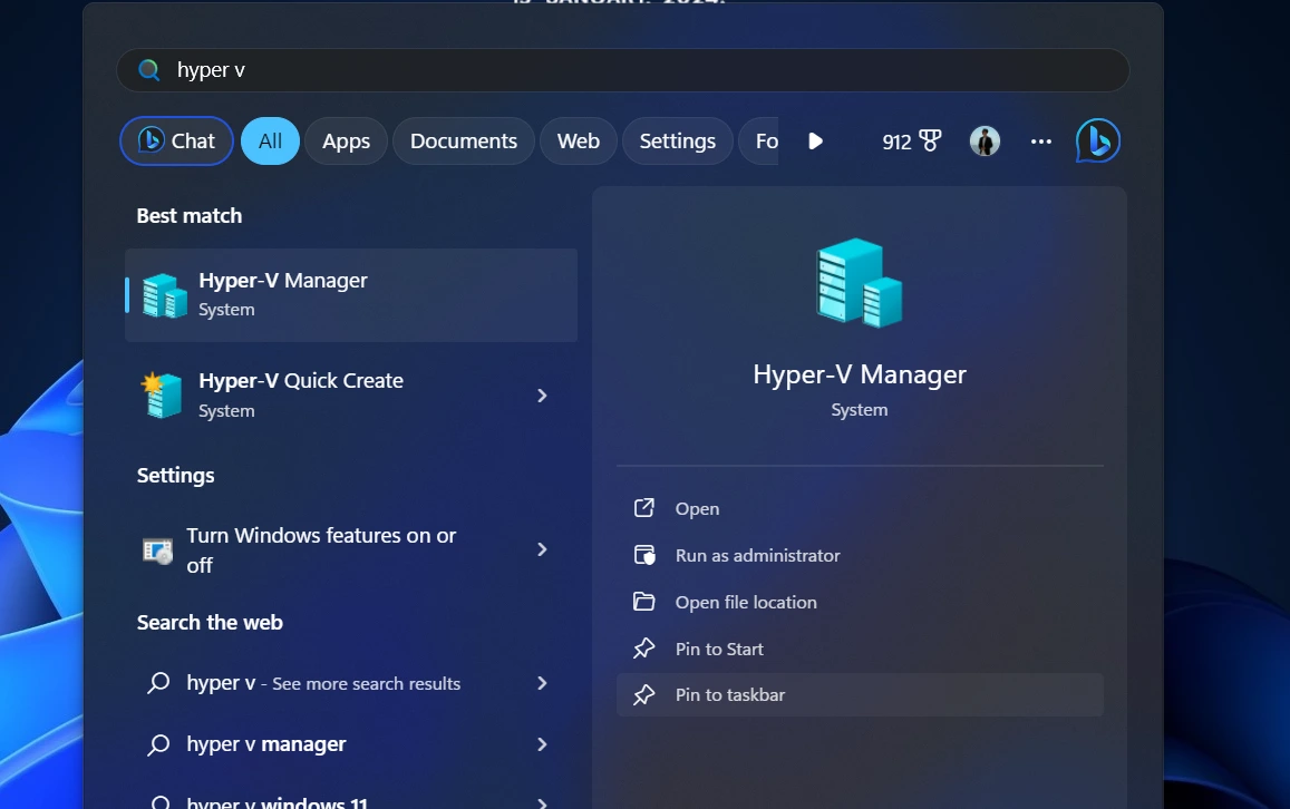 Schritt 7. Hyper-V sollte automatisch installiert werden und Sie können es finden, indem Sie im Startmenü suchen. Es heißt Hyper-V-Manager.