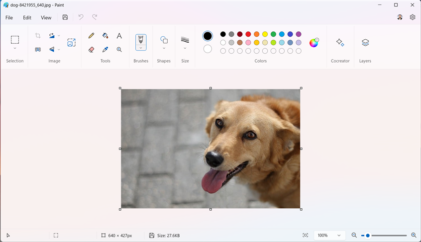 Microsoft Paint führt seine KI-Magie aus und entfernt automatisch den Hintergrund, sodass ein glatter Ausschnitt des Motivs entsteht. Hier ist mein Hund ohne Hintergrund. Cool, nicht wahr?