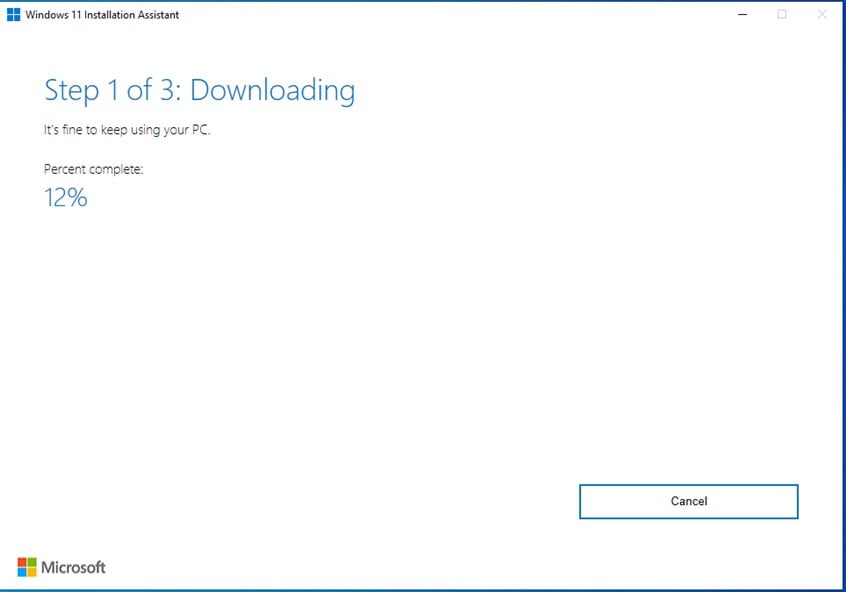 Der Windows 11-Installationsassistent beginnt mit dem Herunterladen der für die Installation von Windows 11 erforderlichen Dateien. Abhängig von der Geschwindigkeit Ihrer Internetverbindung kann dieser Schritt eine Weile dauern. Wenn Sie also Wenn Sie einen Windows 10-Laptop oder ein 2-in-1-Gerät mit Akku verwenden, stellen Sie sicher, dass dieser an eine Steckdose angeschlossen ist. Der Assistent hält Sie permanent über den Download-Fortschritt auf dem Laufenden.