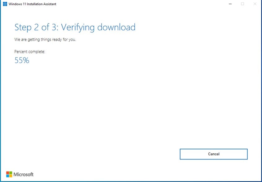 Sobald alle Windows 11-Setupdateien heruntergeladen sind, überprüft der Windows 11-Installationsassistent vor dem Upgrade ihre Integrität. Auch hier wird der Fortschritt in Prozent angezeigt.