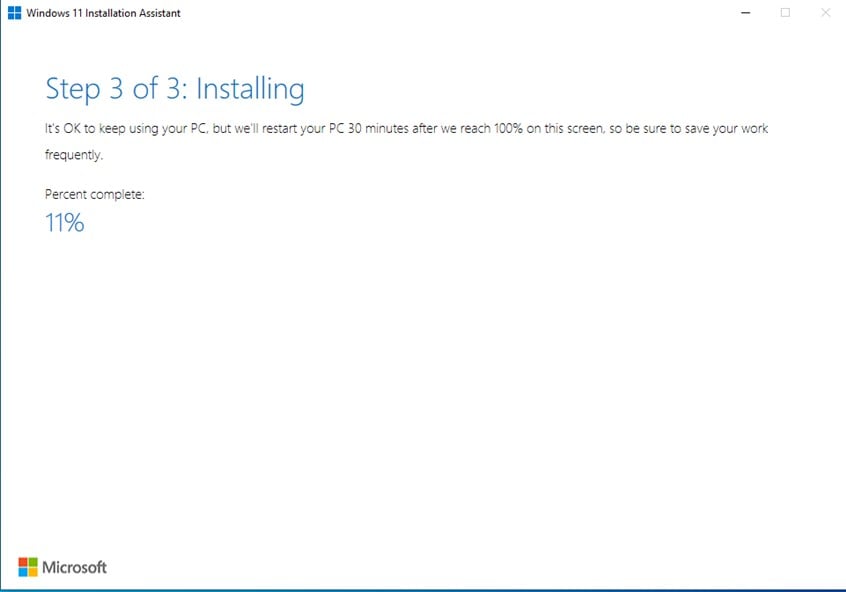 Der dritte Schritt des Upgrades von Windows 10 auf Windows 11 ist die Installation von Windows 11. Beachten Sie, dass der Installationsassistent von Windows 11 langsam ist , insbesondere während dieses Schritts. Die App installiert Windows 11, erstellt ein Backup von Windows 10 und migriert alle Ihre Apps und Dateien von Windows 10 auf Windows 11. Dies wird sicherlich einige Zeit dauern, insbesondere wenn Sie Windows 10 schon viele Jahre verwenden.