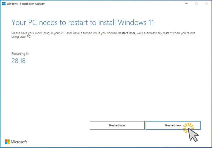 Wenn der dritte Schritt endet, werden Sie darüber benachrichtigt „Ihr PC muss neu gestartet werden, um Windows 11 zu installieren.“ Sie können 30 Minuten warten, bis Ihr PC automatisch neu startet, oder Sie können den Vorgang beschleunigen, indem Sie auf Jetzt neu starten klicken oder tippen. Stellen Sie jedoch sicher, dass Sie alle Ihre Apps und Dateien schließen, bevor Sie dies tun damit du nichts verlierst.