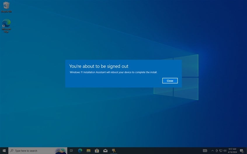 Windows 10 informiert Sie darüber: „Sie werden gleich abgemeldet. Der Windows 11-Installationsassistent startet Ihr Gerät neu, um die Installation abzuschließen.“ Warten Sie oder drücken Sie „Schließen“: Das spielt keine Rolle, denn nach etwa einer Minute startet Windows 10 Ihren PC zum letzten Mal neu.