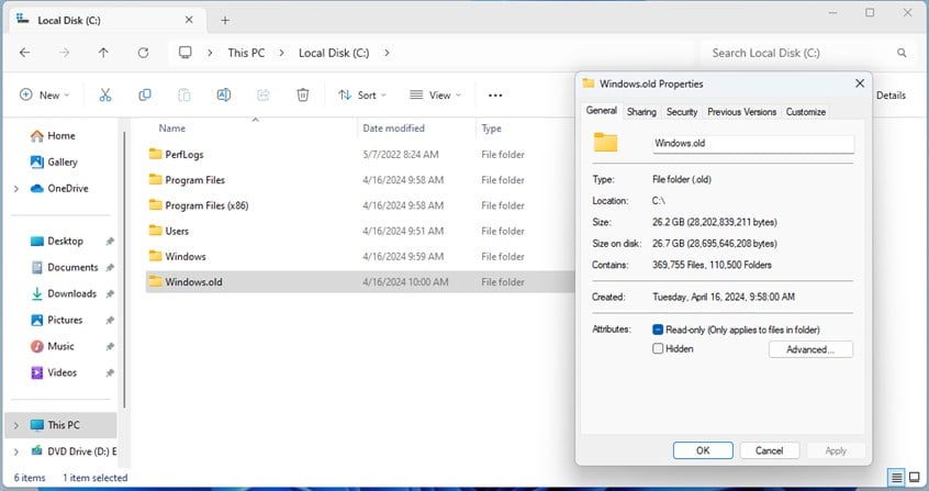 Wenn Sie den Datei-Explorer öffnen und zum Laufwerk C: gehen, werden Sie Suchen Sie einen großen Ordner mit dem Namen „Windows.old“. Hier wird Ihr altes Windows 10 aufbewahrt. Behalten Sie diesen Ordner, wenn Sie sich noch nicht entschieden haben, ob Sie Windows 11 behalten möchten. Er wird verwendet, wenn Sie sich später für ein Downgrade von Windows 11 und einen Rollover entscheiden zurück zu Windows 10.