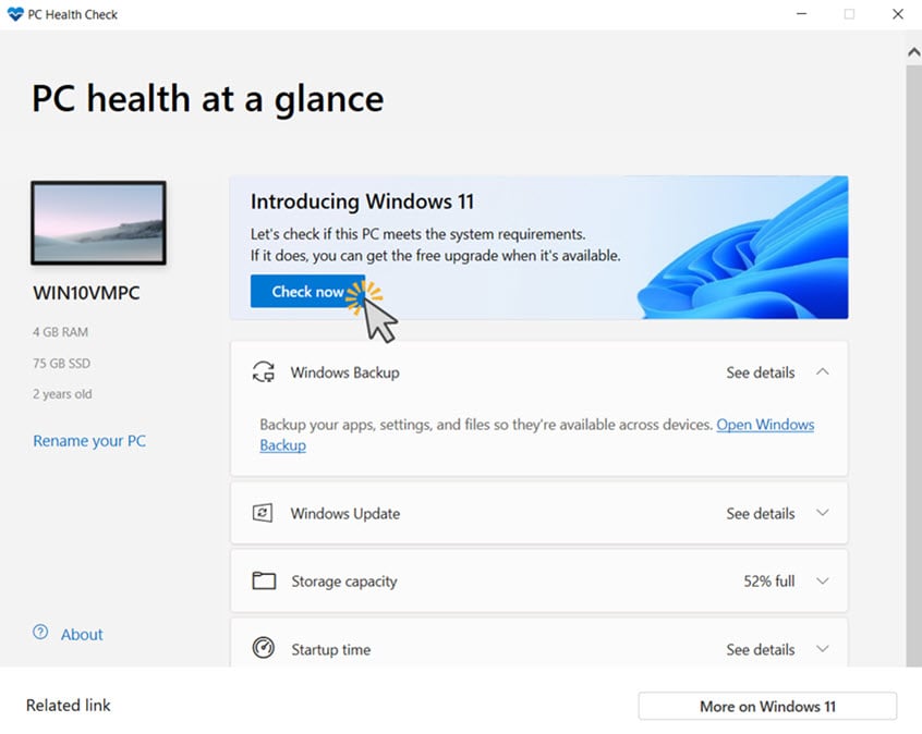 Die PC Health Check-App wird geöffnet. Um zu sehen, ob Ihr Windows 10-Computer die Anforderungen für Windows 11 erfüllt, klicken oder tippen Sie auf Jetzt prüfen.