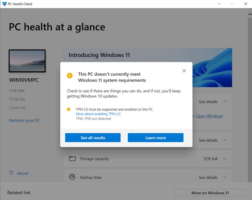 Sie sehen dann die Auswertungsergebnisse. Wenn dies fehlschlägt, wird Ihnen angezeigt, was falsch ist und was Sie beheben müssen, um Windows 11 verwenden zu können. Auf meinem Computer war beispielsweise die TPM 2.0-Verschlüsselung nicht aktiviert und der TPM-Chip auf meinem Windows 10-Computer war im UEFI deaktiviert.