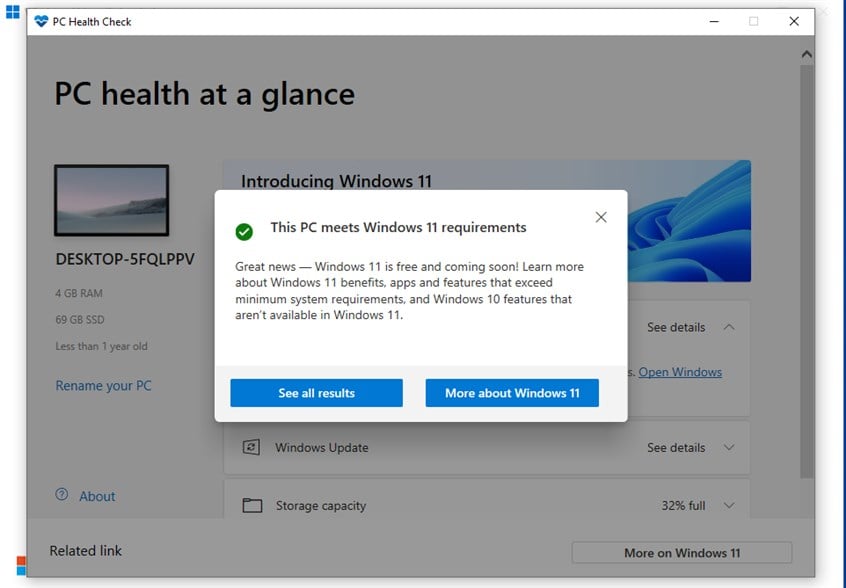 Nachdem der TPM-Chip aktiviert und die Bewertung wiederholt wurde, meldete die PC Health Check-App, dass dieser PC die Windows 11-Anforderungen erfüllt. Anschließend können Sie die App schließen und mit dem Upgrade-Vorgang fortfahren.