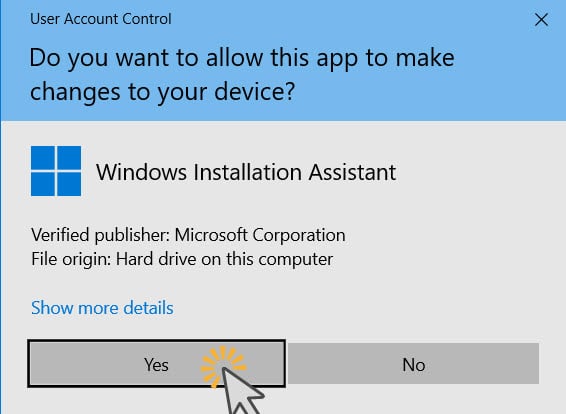 Jetzt können Sie endlich mit dem Upgrade-Vorgang fortfahren. Führen Sie die Datei „Windows11InstallationAssistant.exe“ aus, und wenn Sie eine UAC-Eingabeaufforderung sehen, klicken oder tippen Sie auf „Ja“.