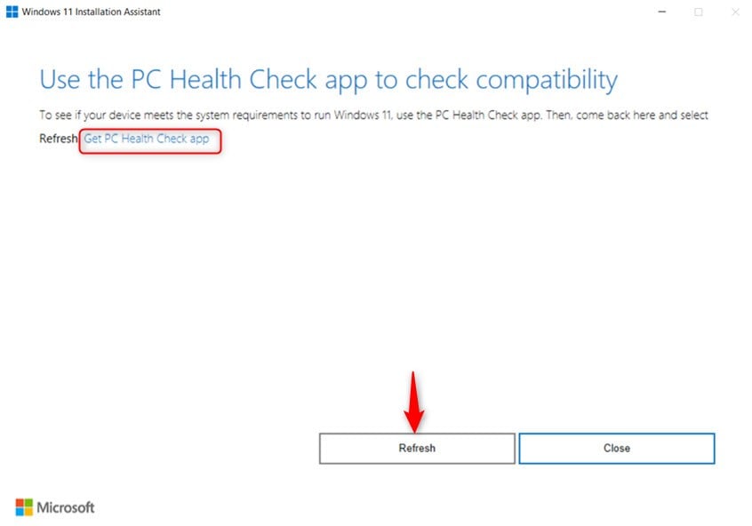 WICHTIG: Wenn Ihr Computer nicht die Windows 11-Systemanforderungen und den PC erfüllt Health Check liefert kein positives Ergebnis, Sie können mit dem Windows 11-Installationsassistenten kein Upgrade auf Windows 11 durchführen. Sie können jedoch eine andere Methode ausprobieren, die in dieser Anleitung ausführlich beschrieben wird: So installieren Sie Windows 11 auf nicht unterstützter Hardware.