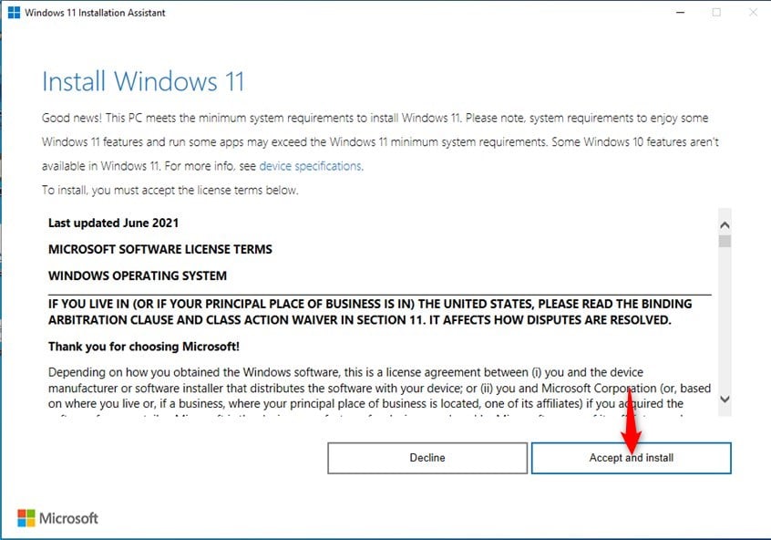 Wenn Ihr PC die Systemanforderungen von Windows 11 erfüllt, fordert Sie der Assistent auf: „ „Installieren Sie Windows 11“ und zeigt Ihnen die „Microsoft Software-Lizenzbedingungen“. Wenn Sie damit einverstanden sind und mit dem Upgrade von Windows 10 auf Windows 11 fortfahren möchten, klicken oder tippen Sie auf „Akzeptieren und installieren“. Wenn der PC die Anforderungen nicht erfüllt, stecken Sie fest und das Einzige, was Sie tun können, ist Schließen der Windows 11-Installationsassistent.