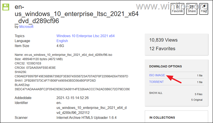 Da Microsoft die direkten Links zum Herunterladen einer LTSC-Edition von Windows 10 entfernt hat, navigieren Sie zu archive.org Windows 10 Enterprise LTSC 2021-Downloadseite* und klicken Sie auf ISO-IMAGE, um das Windows herunterzuladen 10 Enterprise LTSC 2021 in ISO-Datei.
