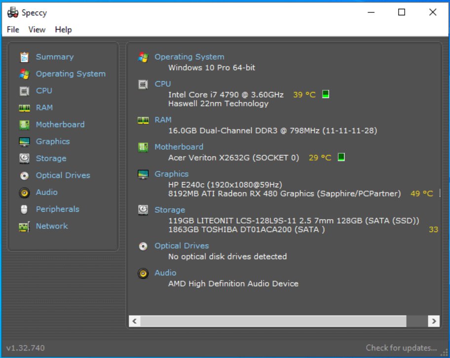Wenn Sie mehr als nur die CPU überprüfen möchten, z. B. Motherboard, Grafik, RAM und Speicher, versuchen Sie es Speccy. Es ist außerdem kostenlos und einfach.
