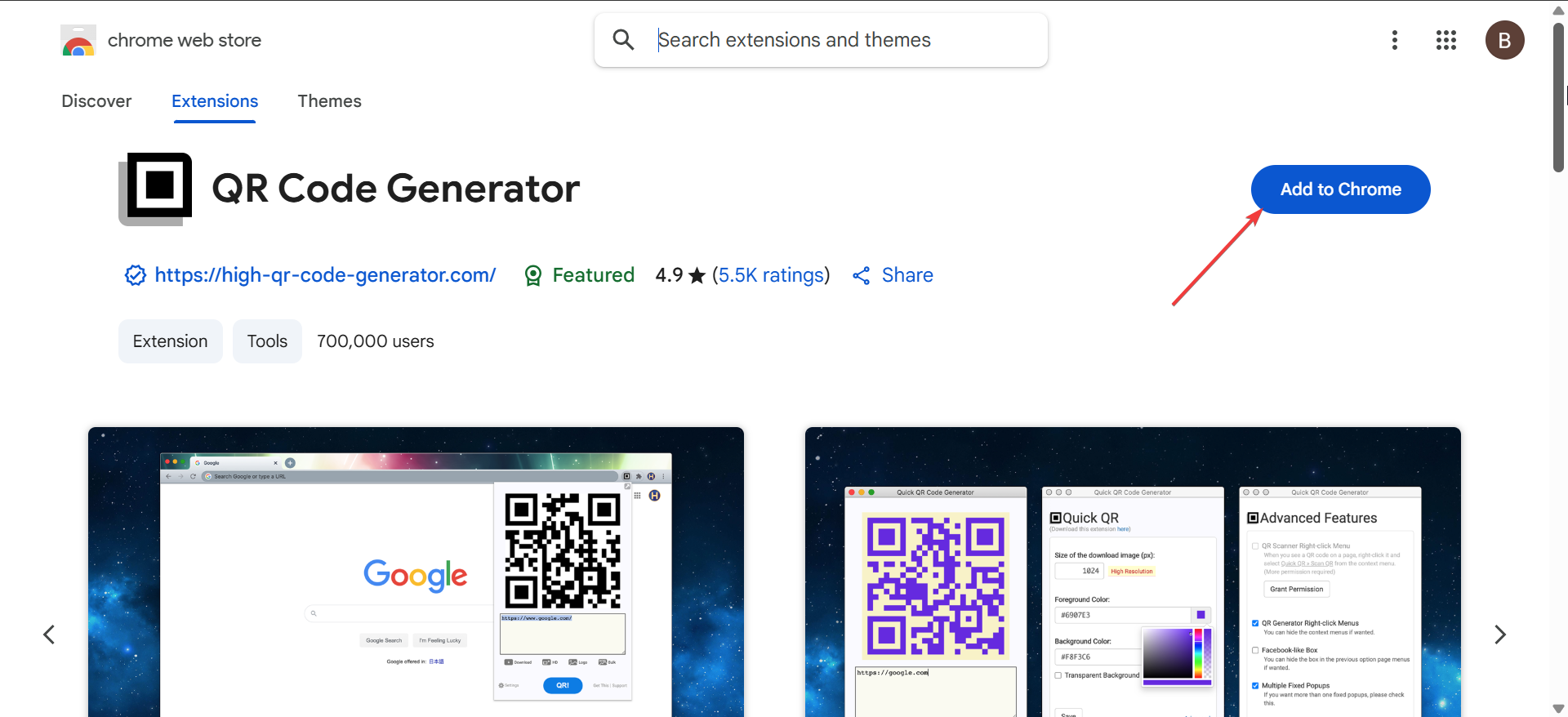 Die integrierten Codes von Chrome sind statisch und schwarzweiß. Wenn Sie Farbthemen, Logos oder nachverfolgbare Scans wünschen, verwenden Sie Erweiterungen wie den QR Code Generator, die im Chrome Web Store verfügbar sind. Klicken Sie einfach auf die Schaltfläche „Zu Chrome hinzufügen“ und die Erweiterung wird Ihrem Browser hinzugefügt.