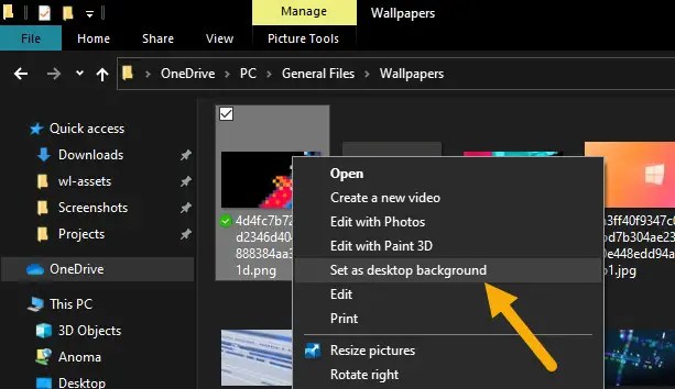 Gehen Sie nun zu dem Ordner, in dem Sie Ihre Hintergrundbilder gespeichert haben. Als Nächstes suchen Sie das Hintergrundbild, klicken darauf und wählen Sie die Option „Als Desktop-Hintergrund festlegen aus.