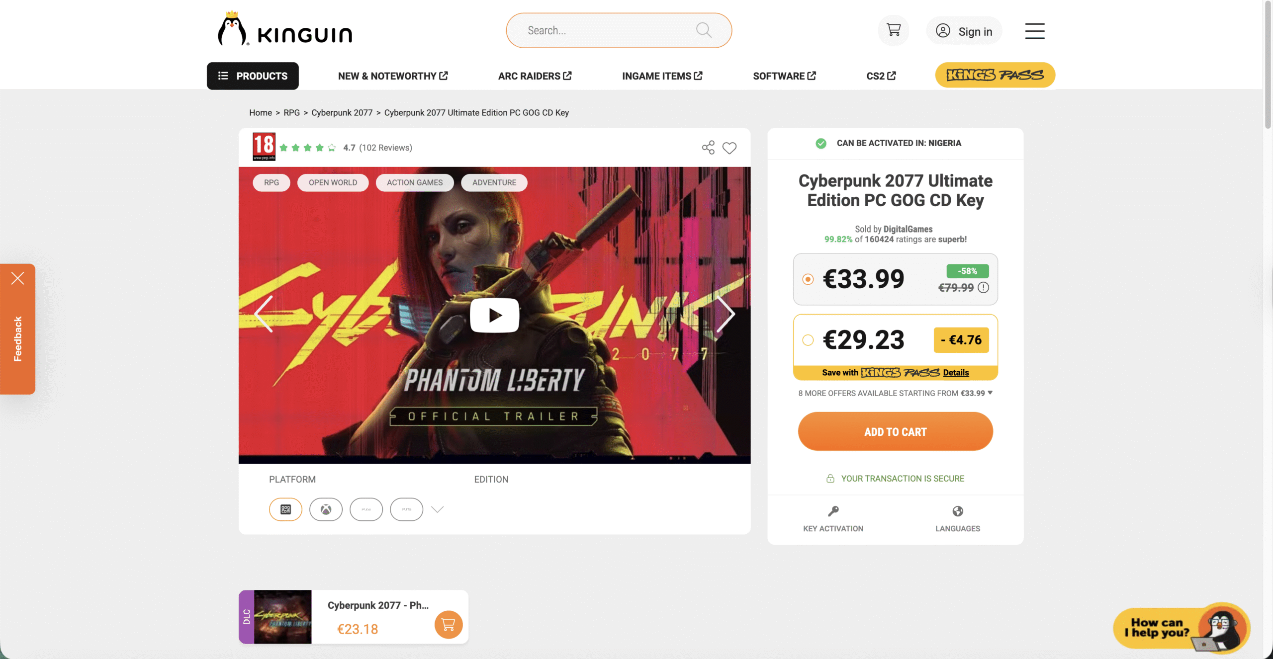 Kinguin bietet ein optionales Käuferschutzprogramm an, das Ihrer Bestellung eine zusätzliche Gebühr hinzufügt. Im Gegenzug verspricht die Plattform zusätzliche Hilfe, wenn ein Schlüssel nicht wie angekündigt funktioniert. Dies soll das Risiko verringern, bei Drittanbietern auf einer Graumarkt-Website einzukaufen.