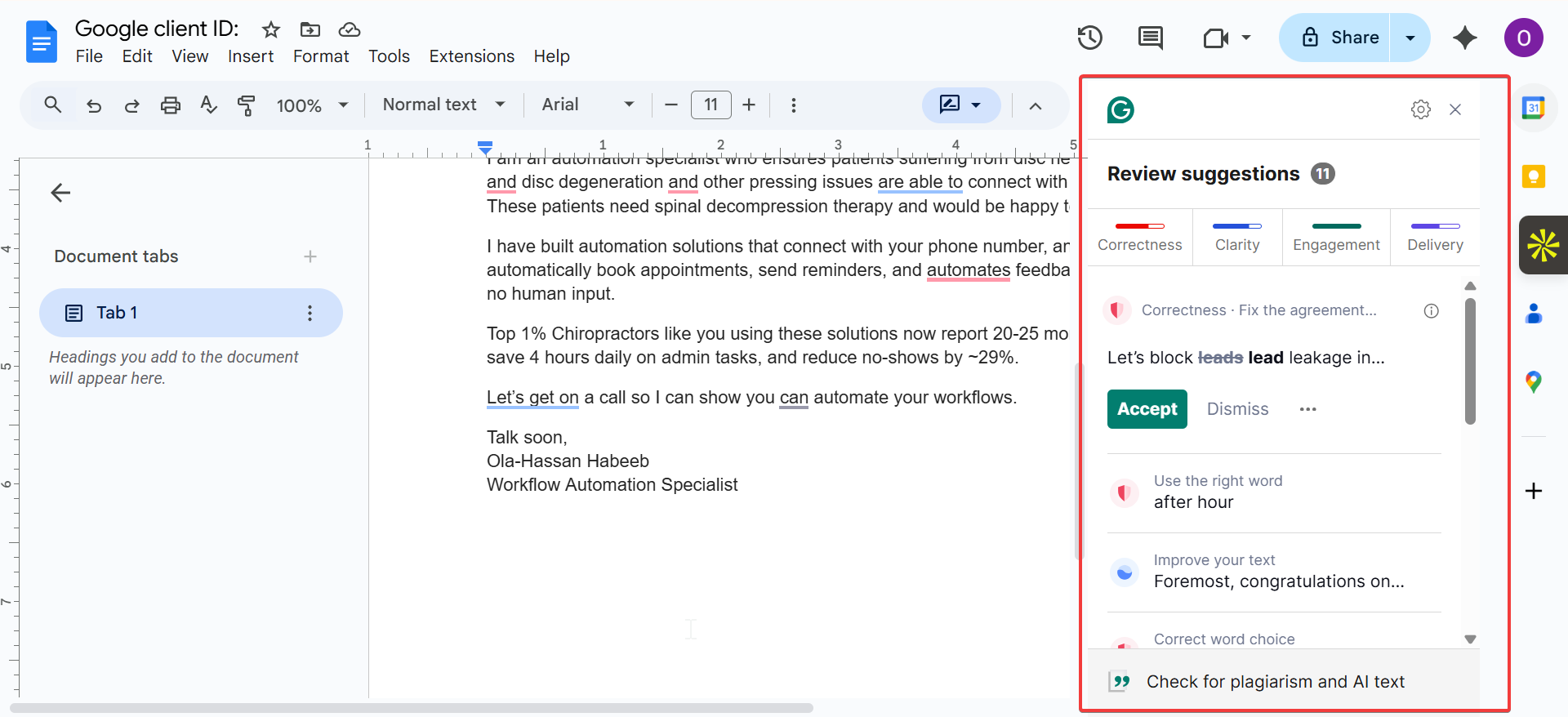 Öffnen Sie abschließend ein Google Docs-Dokument und suchen Sie nach der Grammarly-Seitenleiste oder dem G-Symbol. Wenn Sie Unterstreichungen und Vorschläge sehen, funktioniert die Erweiterung auf dieser Seite ordnungsgemäß.