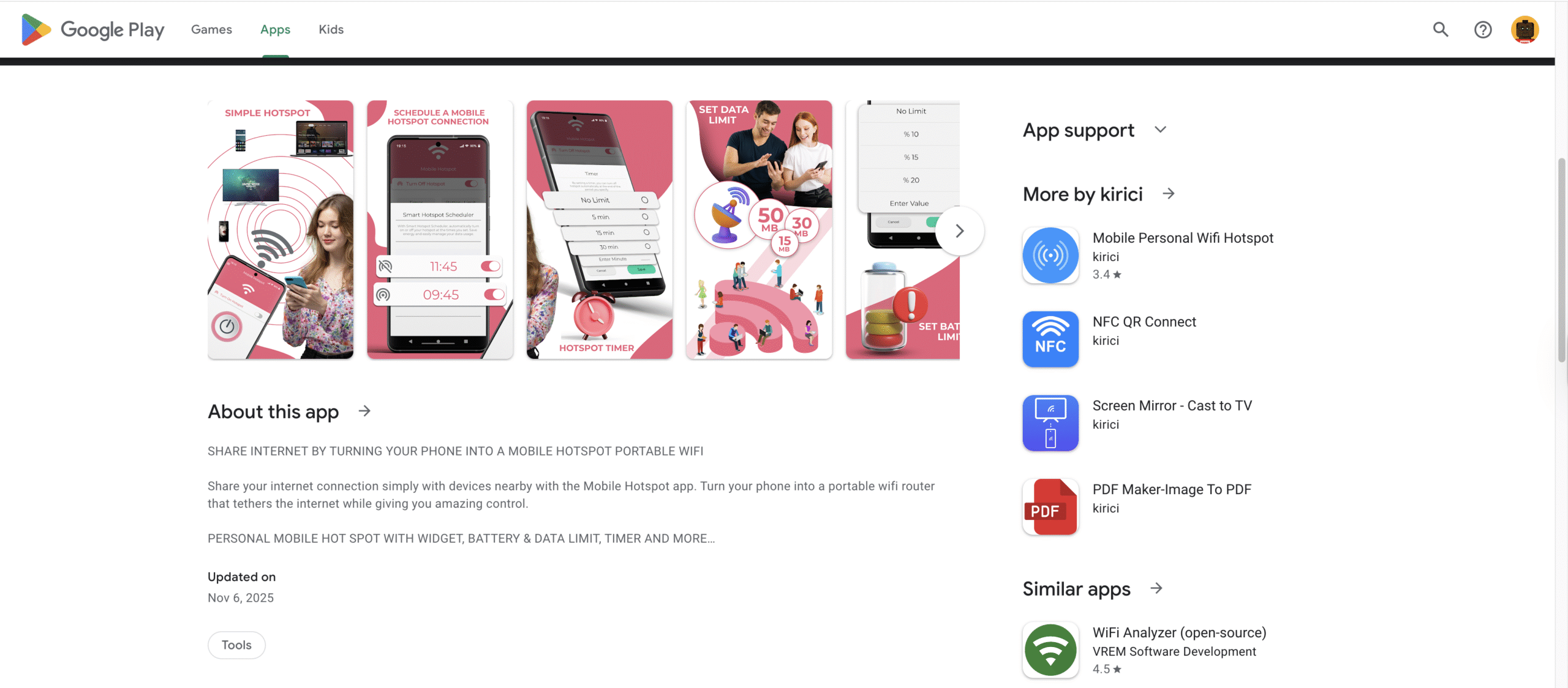 Diese App bietet eine breite Palette an Funktionen: Sie können planen, wann der Hotspot ein-und ausgeschaltet wird, über USB oder Bluetooth teilen und sogar einen QR-Code generieren, damit andere eine Verbindung herstellen können. Es unterstützt die Überwachung angeschlossener Geräte und ist für eine Vielzahl von Android-Versionen konzipiert. Aufgrund seiner starken Steuerungsfunktionen ist es die erste Wahl, wenn Sie mehr als nur einfaches Tethering benötigen.