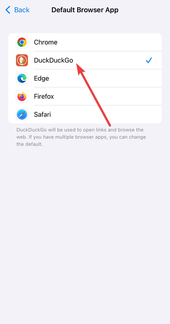 Tipp: Wenn iOS den Standardbrowser nicht speichert, deaktivieren Sie die Bildschirmzeitbeschränkungen, aktualisieren Sie iOS auf die neueste Version und installieren Sie DuckDuckGo neu, wenn die Option verschwindet.