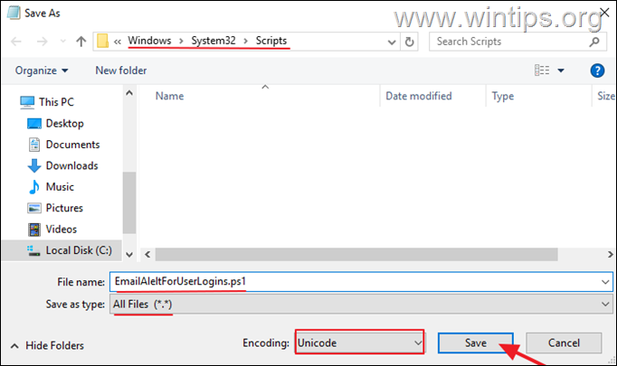 Wählen Sie „Speichern“ der Datei im zuvor erstellten Ordner „Skripte“. Wählen Sie unter Speichern unter: Alle Dateien. Wählen Sie unter Kodierung: Unicode . Geben Sie Folgendes ein: Dateiname: “EmailAleltForUserLogins.ps1”. Klicken Sie auf Speichern und schließen Sie dann den Editor.