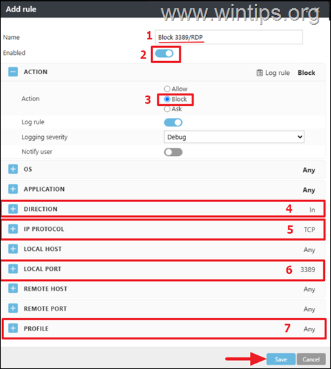 Geben Sie einen Namen für die neue Regel ein (z. B. „Block 3389/RDP“)* und wenden Sie unten die folgenden Einstellungen an: Legen Sie die Regel fest auf: Aktiviert AKTION: Blockieren RICHTUNG: In IP-PROTOKOLL: TCP LOKALER PORT: 3389 PROFIL: Beliebig