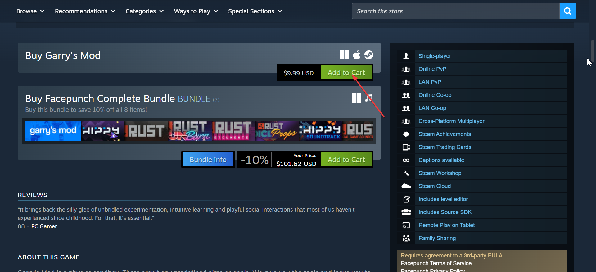 Die meisten Gmod-Spieler verwenden Windows, daher bietet Ihnen dieser Pfad die schnellste Möglichkeit, das Spiel zu installieren. Öffnen Sie zunächst Steam, melden Sie sich an und suchen Sie im Store nach Garrys Mod. Klicken Sie auf die Schaltfläche Kaufen oder In den Warenkorb, fügen Sie es Ihrer Bibliothek hinzu und klicken Sie auf Installieren. Steam beginnt sofort mit dem Herunterladen der Spieldateien.