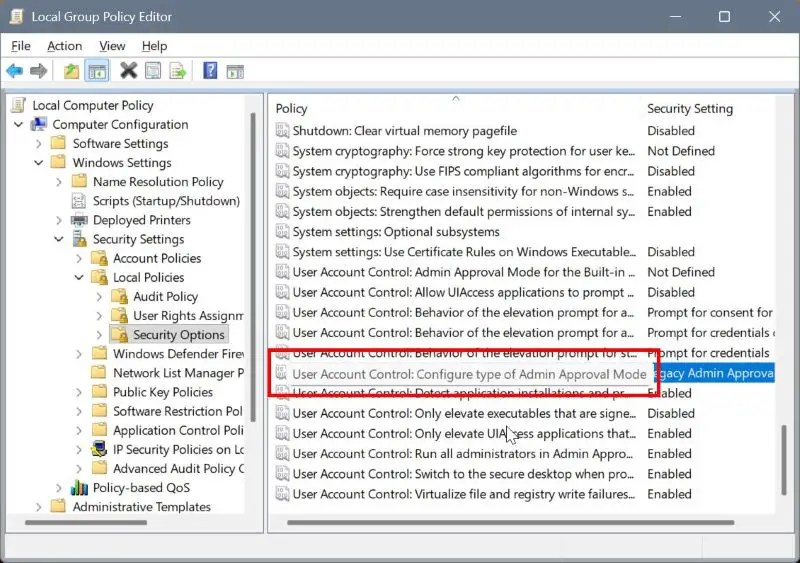 Stellen Sie nun sicher, dass Sie sich auf der Registerkarte „Lokale Sicherheitseinstellungen“ befinden, und wählen Sie „ „Administratorgenehmigungsmodus mit Administratorschutz“ aus dem Dropdown-Menü. Klicken Sie auf die Schaltfläche „OK“, um die Änderungen zu speichern.