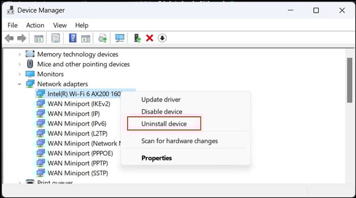Öffnen Sie den Geräte-Manager.Erweitern Sie Netzwerkadapter und klicken Sie mit der rechten Maustaste auf Ihr WLAN-Gerät.Wählen Sie Gerät deinstallieren> Deinstallieren. Starten Sie Ihren PC neu. Ihr System sollte den Wi-Fi-Treiber automatisch installieren.