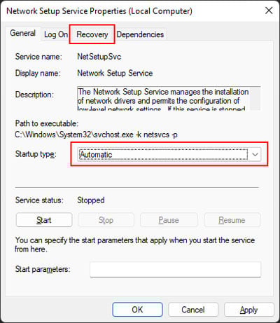 Öffnen Sie die Windows-Dienste. Suchen Sie nach Network Setup Service und doppelklicken Sie darauf. Stellen Sie Starttyp auf Automatisch ein. strong>und gehen Sie zur Registerkarte Wiederherstellung .Stellen Sie das Dropdown-Feld neben Erster Fehler ein, um den Dienst neu zu starten.