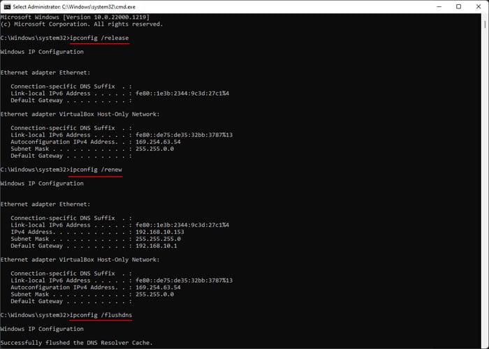 Ausführen. Geben Sie cmd ein und drücken Sie Strg + Umschalt + Eingabe, um die erhöhte Eingabeaufforderung zu öffnen. Geben Sie die folgenden Befehle ein: ipconfig/releaseipconfig/renewipconfig/flushdnsnetsh winsock resetnetsh int ip reset