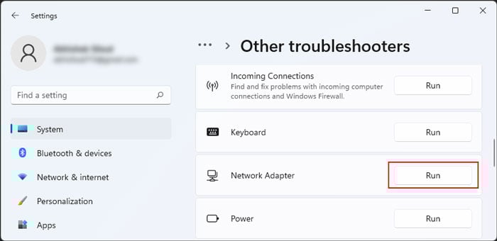 Öffnen Sie Ausführen. Geben Sie ms-settings:troubleshoot ein, um die Einstellungen zur Fehlerbehebung zu öffnen. Klicken Sie auf Andere Fehlerbehebungen oder Zusätzliche Fehlerbehebungen . Wählen Sie Ausführen neben Netzwerkadapter oder Netzwerkadapter > Diese Fehlerbehebung ausführen aus.