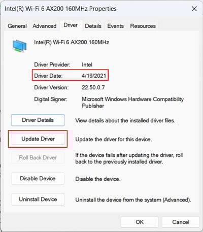 Dieses Problem kann auch auftreten, wenn Ihr Wi-Fi oder WLAN-Treiber ist veraltet oder fehlerhaft. Sie müssen es auf die neueste Version aktualisieren, um solche Probleme zu vermeiden.