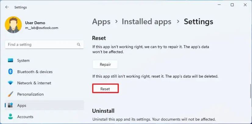 Nachdem Sie die Schritte abgeschlossen haben, wird die App neu installiert und auf die Standardeinstellungen von Windows 11 zurückgesetzt.