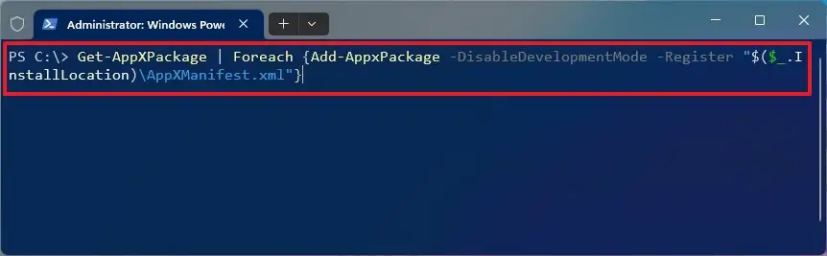 Get-AppXPackage | Foreach {Add-AppxPackage-DisableDevelopmentMode-Register”$($_.InstallLocation)\AppXManifest.xml”}