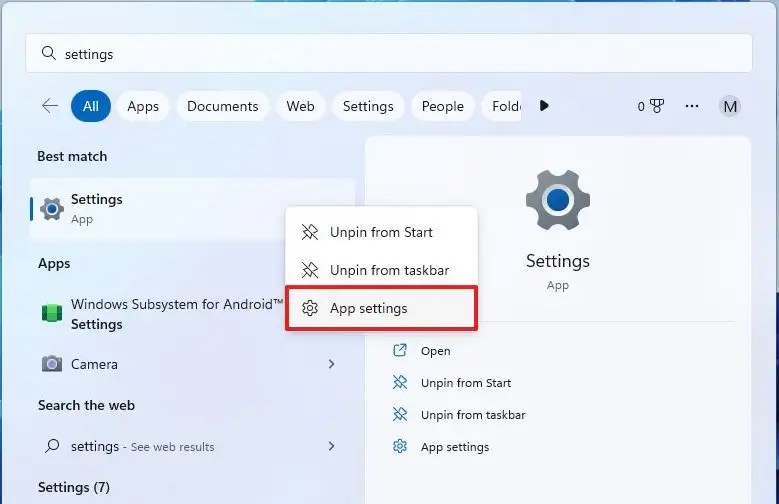 Suchen Klicken Sie für Einstellungen mit der rechten Maustaste auf das oberste Ergebnis und wählen Sie die Option App-Einstellungen aus.