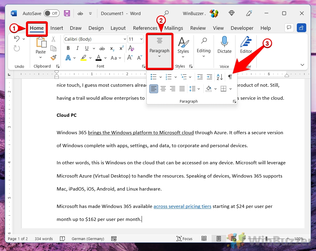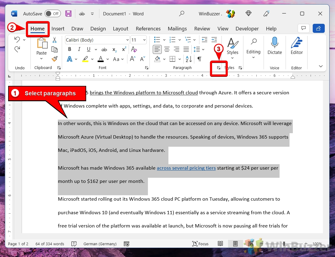 Επιλέξτε τις σχετικές παραγράφους εάν θέλετε να χρησιμοποιήσετε αυτόματες αλλαγές σελίδας μόνο για μια συγκεκριμένη ενότητα μέσα στο έγγραφο του Word. Στη συνέχεια, μεταβείτε στην “Αρχική σελίδα” στην Κορδέλα και κάντε κλικ στο μικρό κουμπί κάτω δεξιά στην “Παράγραφος” πλαίσιο.