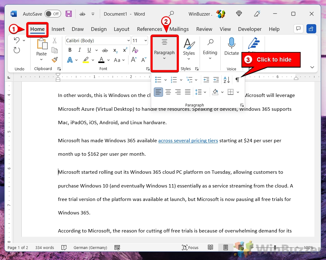 Κάντε κλικ στο”Αρχική σελίδα”στην Κορδέλα, μετά”Παράγραφος”και κάντε κλικ στο κουμπί “Εμφάνιση/Απόκρυψη”, που αντιπροσωπεύεται από το σύμβολο της παραγράφου (¶).