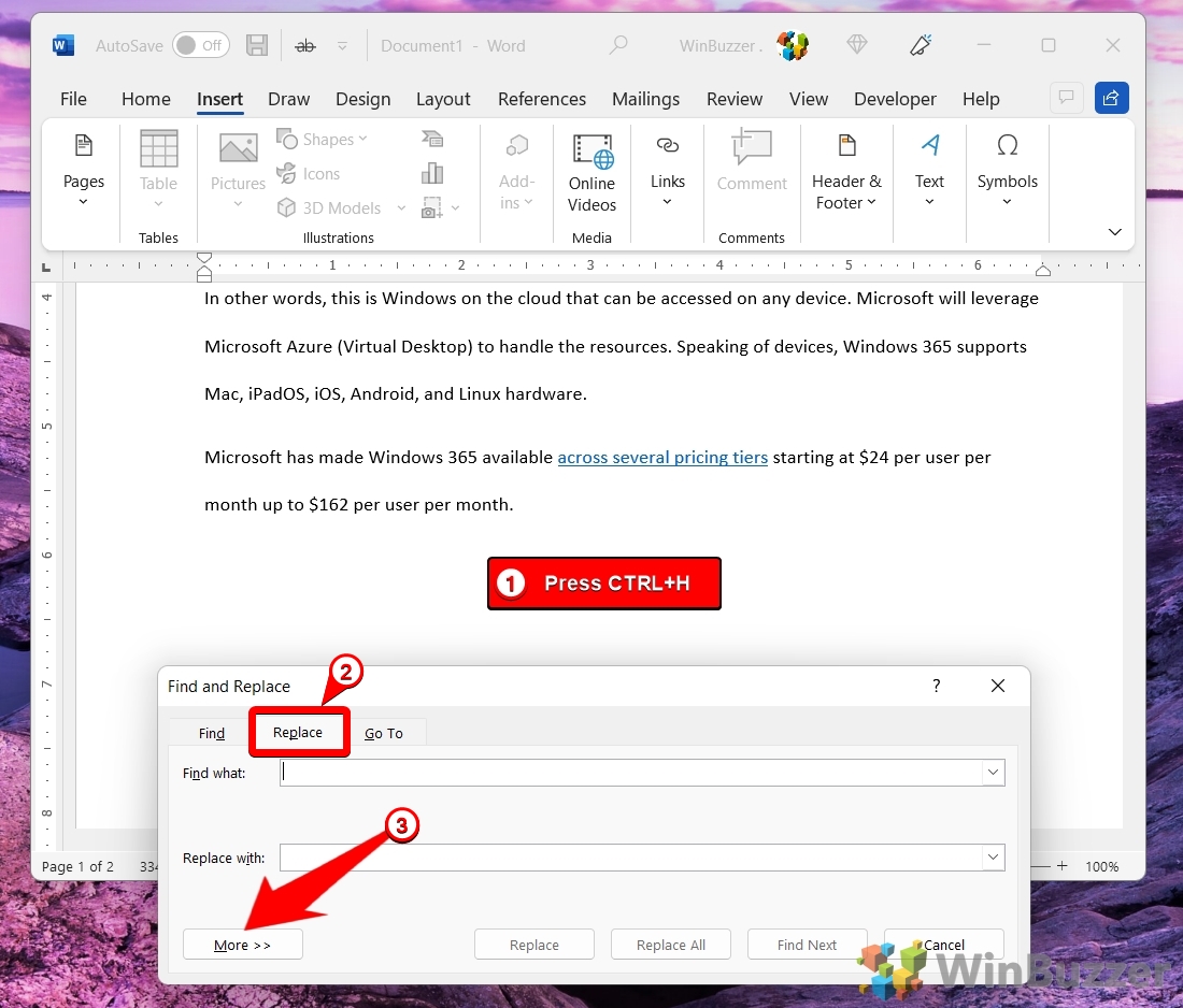 Πατήστε τη συντόμευση “CTRL+H”, κάντε κλικ στο “Αντικατάσταση” και μετά στο “Περισσότερα >>”.