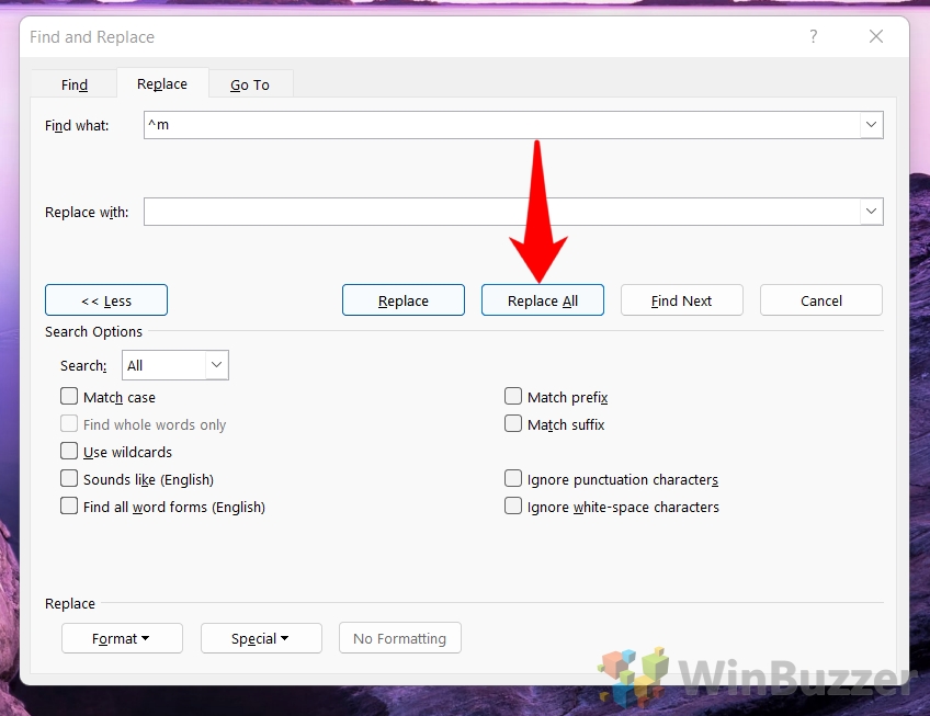 Αφήστε κενό το πεδίο”Αντικατάσταση με”και κάντε κλικ στην επιλογή”Αντικατάσταση”ή”Αντικατάσταση όλων”