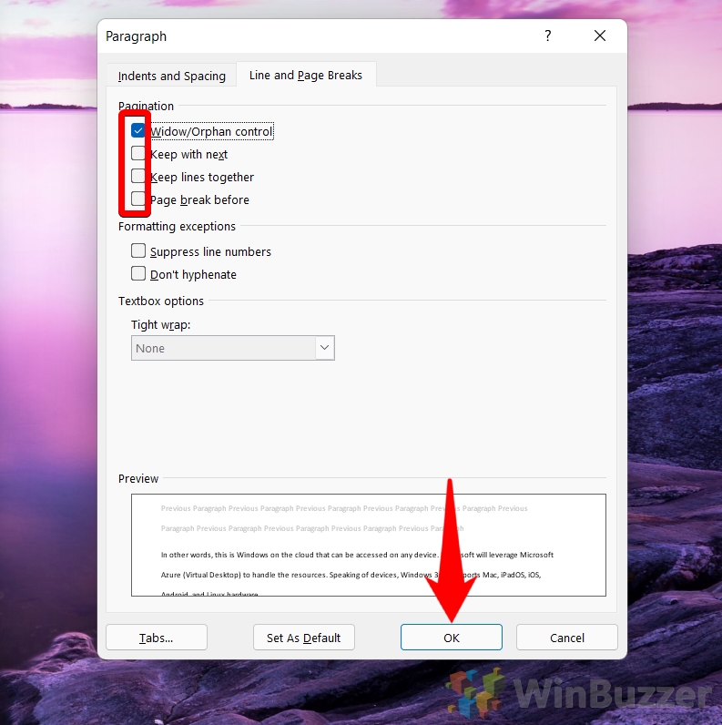 Όταν είναι επιλεγμένο , αυτό διασφαλίζει ότι οι μεμονωμένες γραμμές μιας παραγράφου δεν εμφανίζονται μόνες στο επάνω μέρος (χήρα) ή στο κάτω μέρος (ορφανό) μιας σελίδας. Το Word θα προσαρμόσει την αλλαγή σελίδας για να εξασφαλίσει ότι τουλάχιστον δύο γραμμές μιας παραγράφου εμφανίζονται μαζί είτε στο τέλος είτε στην αρχή μιας σελίδας.