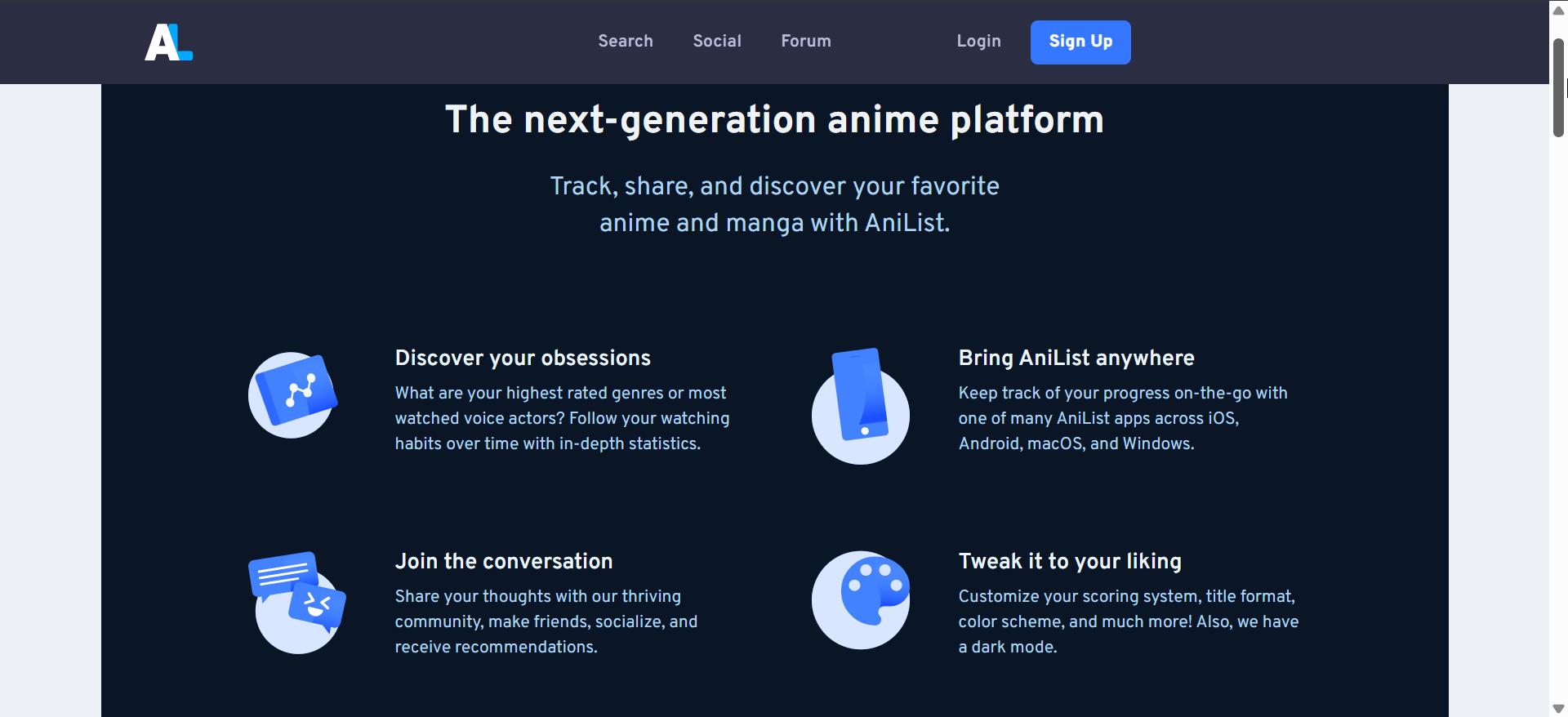 Το AniList ξεχωρίζει με τη μοντέρνα διεπαφή και τον μινιμαλιστικό σχεδιασμό του. Επιτρέπει στους χρήστες να οργανώνουν λίστες, να παρακολουθούν εκπομπές και να οπτικοποιούν στατιστικά, όπως είδη που παρακολουθούν ή συνολικές ώρες που έχουν καταγραφεί. Ο ιστότοπος δημιουργεί επίσης μικρο-κοινότητες μέσω συλλόγων, σχολίων τροφοδοσίας και εμφανίζει συγκεκριμένα νήματα.